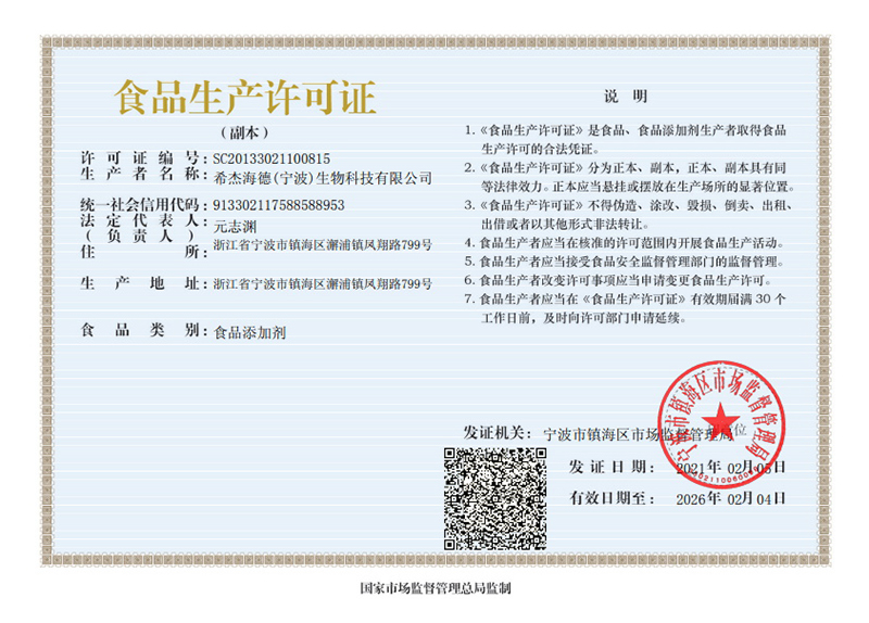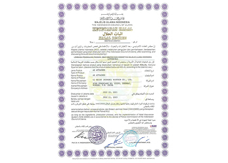 海德公司建立了嚴格的生產,質量和食品安全管理體系。擁有食品添加劑生產許可證,質量管理認證,食品安全認證,包括:ISO9001:2008認證、ISO22000:2015認證、BRC認證認證,和Star-K頒發的KOSHER認證、IFANCA 和MUI 頒發的HALAL認證公司。