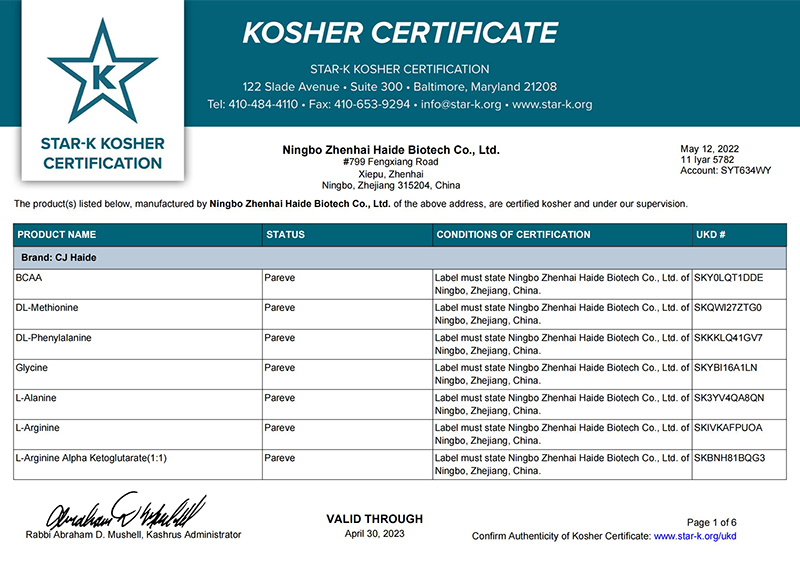 寧波市鎮海海德生化科技有限公司秉承“質量為本,真誠守信”的經營方針,海德尊崇“踏實、拼搏、責任”的企業精神,為以合作、共贏,開創的經營理念,創造良好的企業環境;持續穩定地為全世界客戶提供高品質的氨基酸產品!